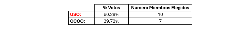 La candidatura de USO ha conseguido la mayoría del comité, con el siguiente resultado: